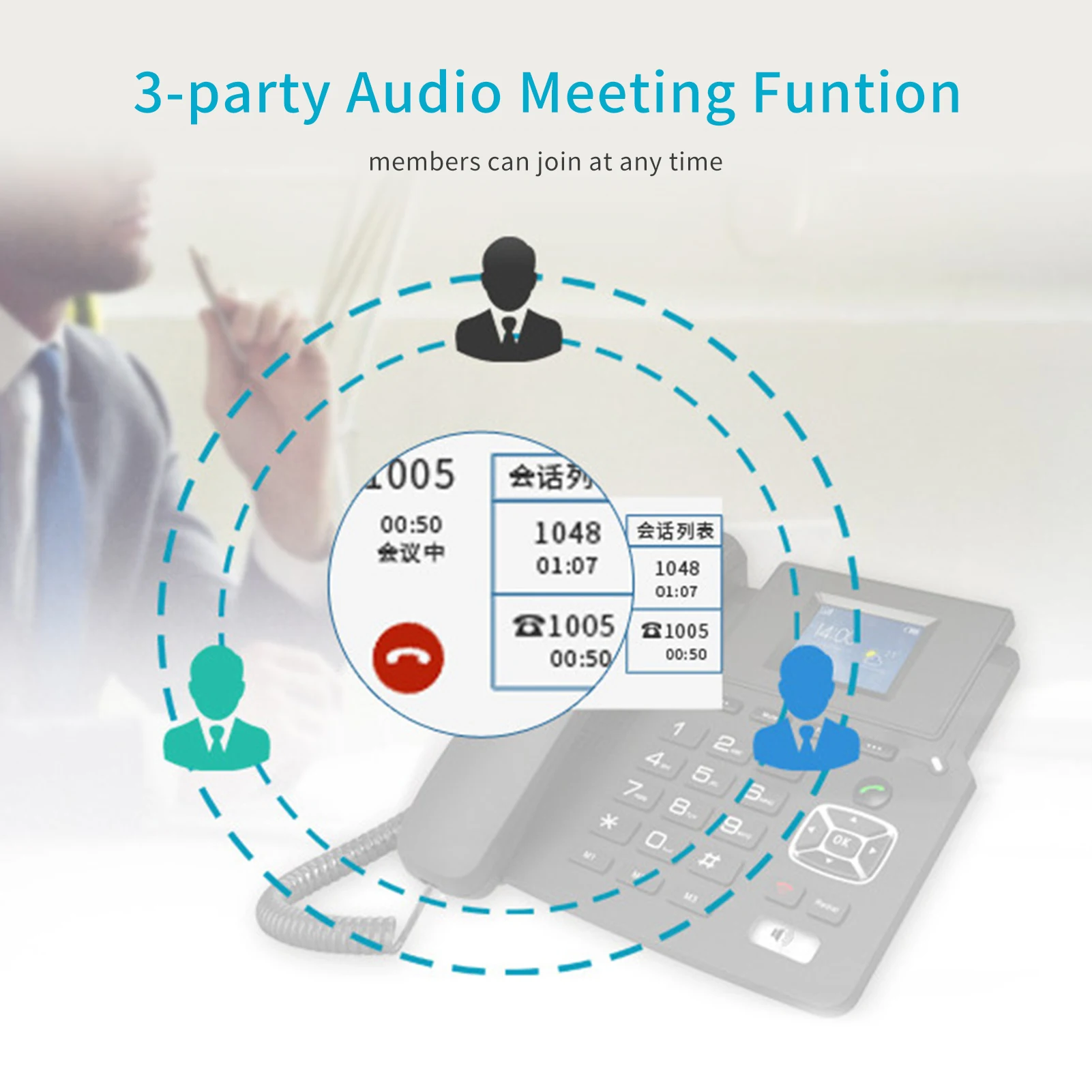 Function - 3 Speed dial keys, 2-9 Number keys Can be customized as function keys; store 500 contacts and 50 call records, unread voice message prompt and so on; 6 system language - Chinese, English, Korean, Portuguese, Français, Español; Supports 3-party audio conference, and members can join at any time.