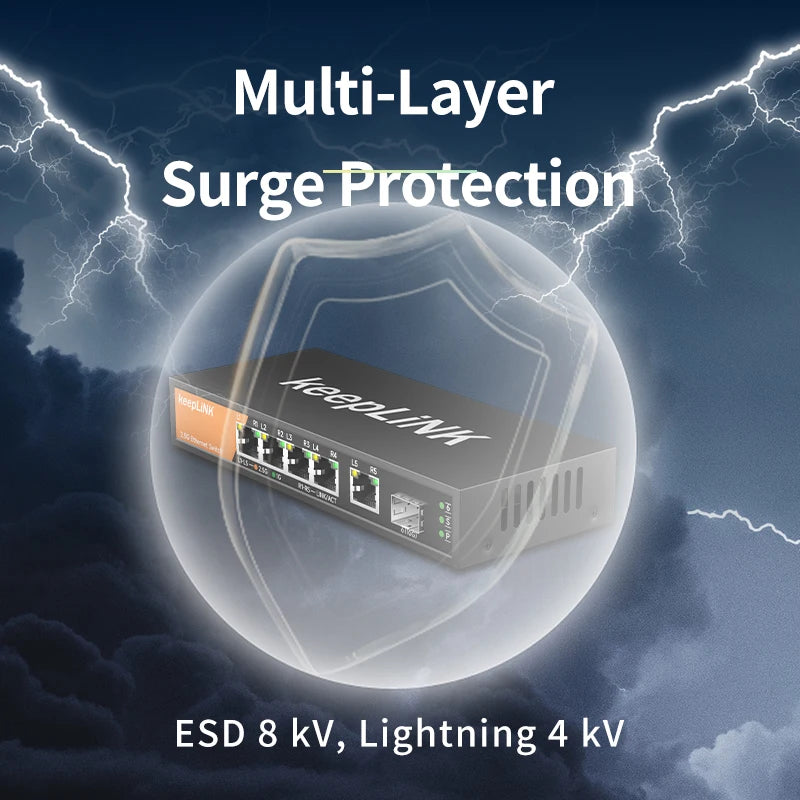 The KeepLink 5-port Multi-Gigabit Unmanaged Switch, KP-9000-6XH-X, helps businesses cost effectively expand their networks with multi-gig speeds. The KP-9000-6XH-X Multi-Gigabit Ethernet switch comes with five (5) 2.5G ports and one (1) 10G SFP+ port in a metal case and can be placed on a desk or mounted on a wall with the included wall-mount kit. This switch is energy efficient, built to last, and rigorously tested to provide the reliability businesses need. 802.1p traffic prioritization and jumbo frame support allow for seamless integration with more sophisticated networks.