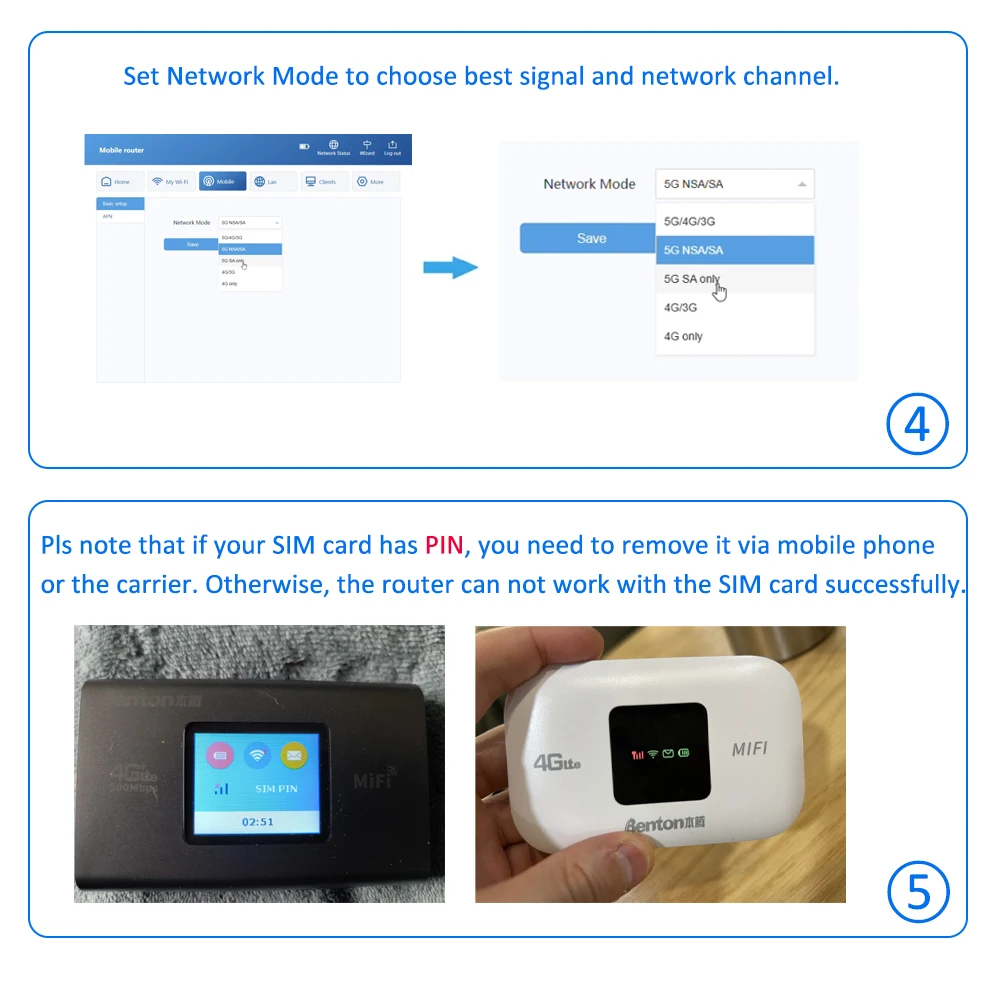 ●If your SIM card has PIN code/lock, you need to disable PIN code/lock on your phone or via communication operator. It can help the router get access to recognize your SIM card and connect network. Otherwise, the router shows no SIM and its WiFi can be connected but no network.
