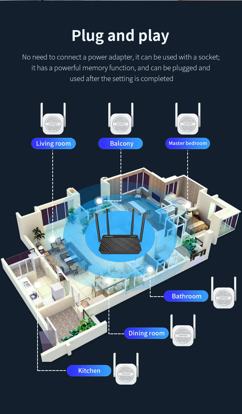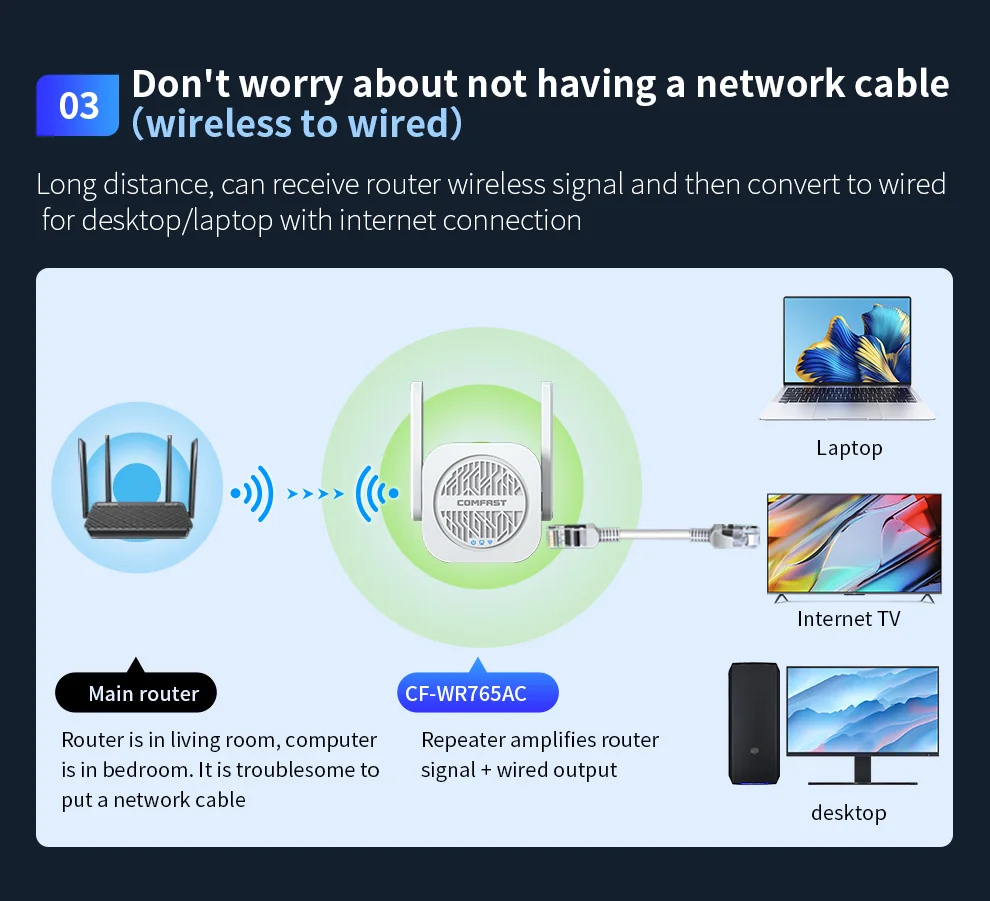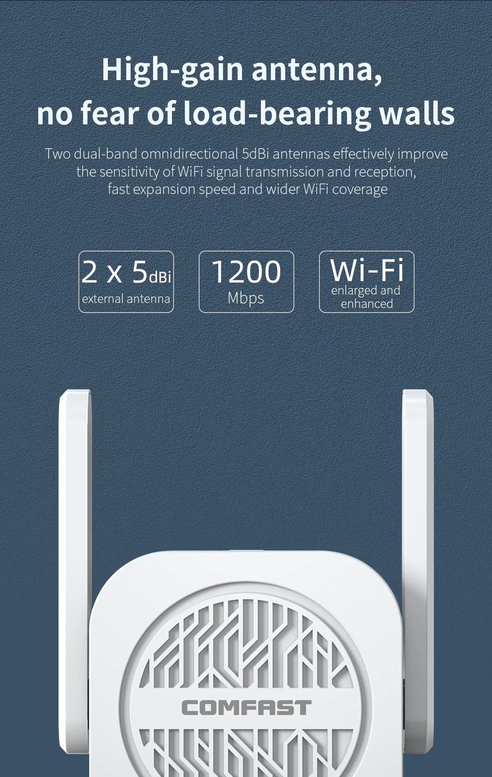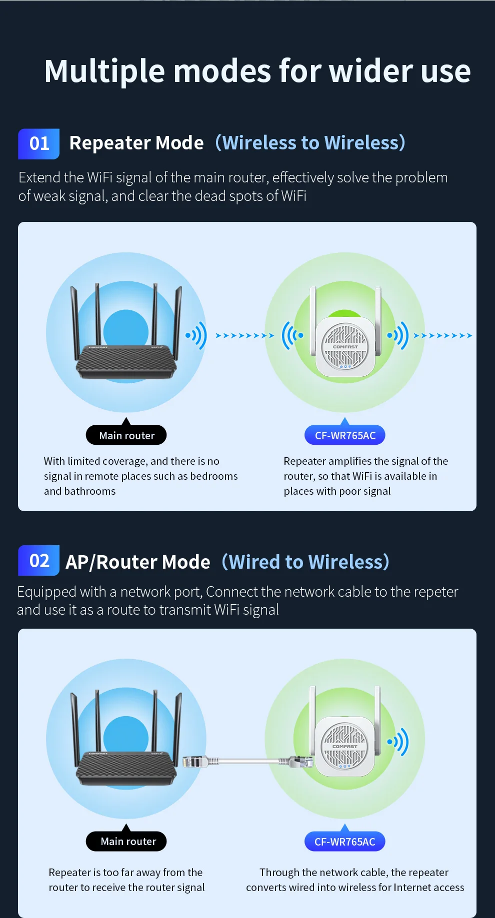 CF-WR765AC is a 1200Mbps dual band WiFi signal amplifier equipped with 2 high gain antennas for signal enhancement, with 4 independent signal amplifiers built-in. When used with a router, it can eliminate dead corners of WiFi signals at home, solve problems such as large multi bedroom areas and incomplete routing coverage in large houses, effectively expand WiFi coverage, and achieve true full house WiFi coverage.