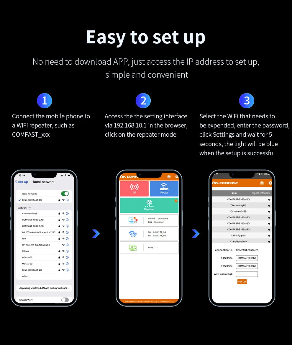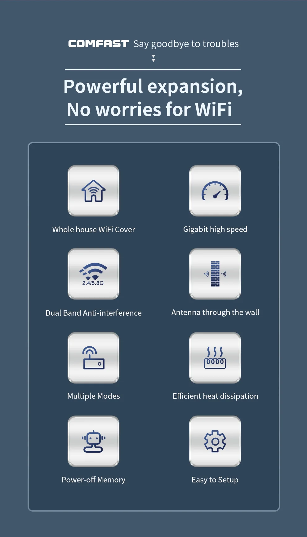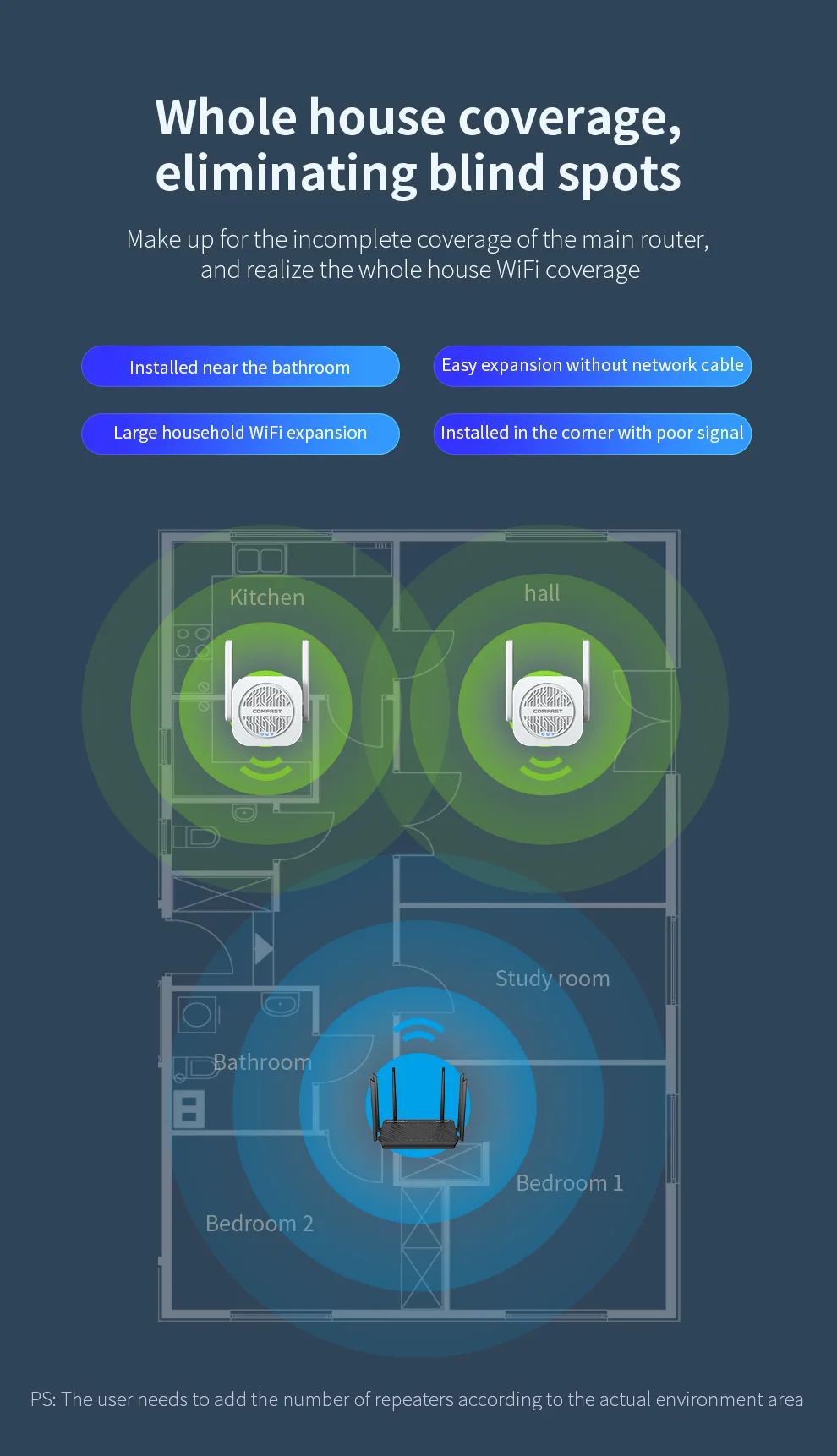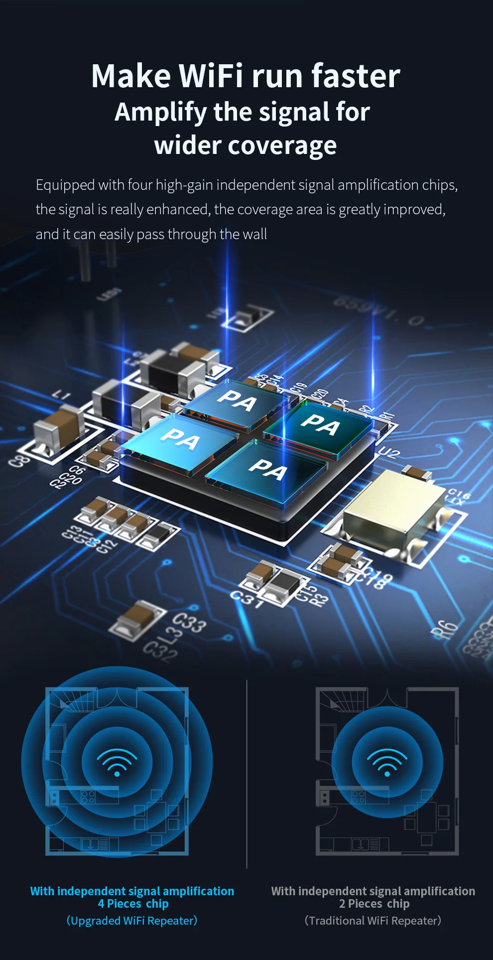 CF-WR765AC is a 1200Mbps dual band WiFi signal amplifier equipped with 2 high gain antennas for signal enhancement, with 4 independent signal amplifiers built-in. When used with a router, it can eliminate dead corners of WiFi signals at home, solve problems such as large multi bedroom areas and incomplete routing coverage in large houses, effectively expand WiFi coverage, and achieve true full house WiFi coverage.