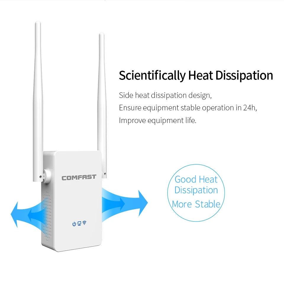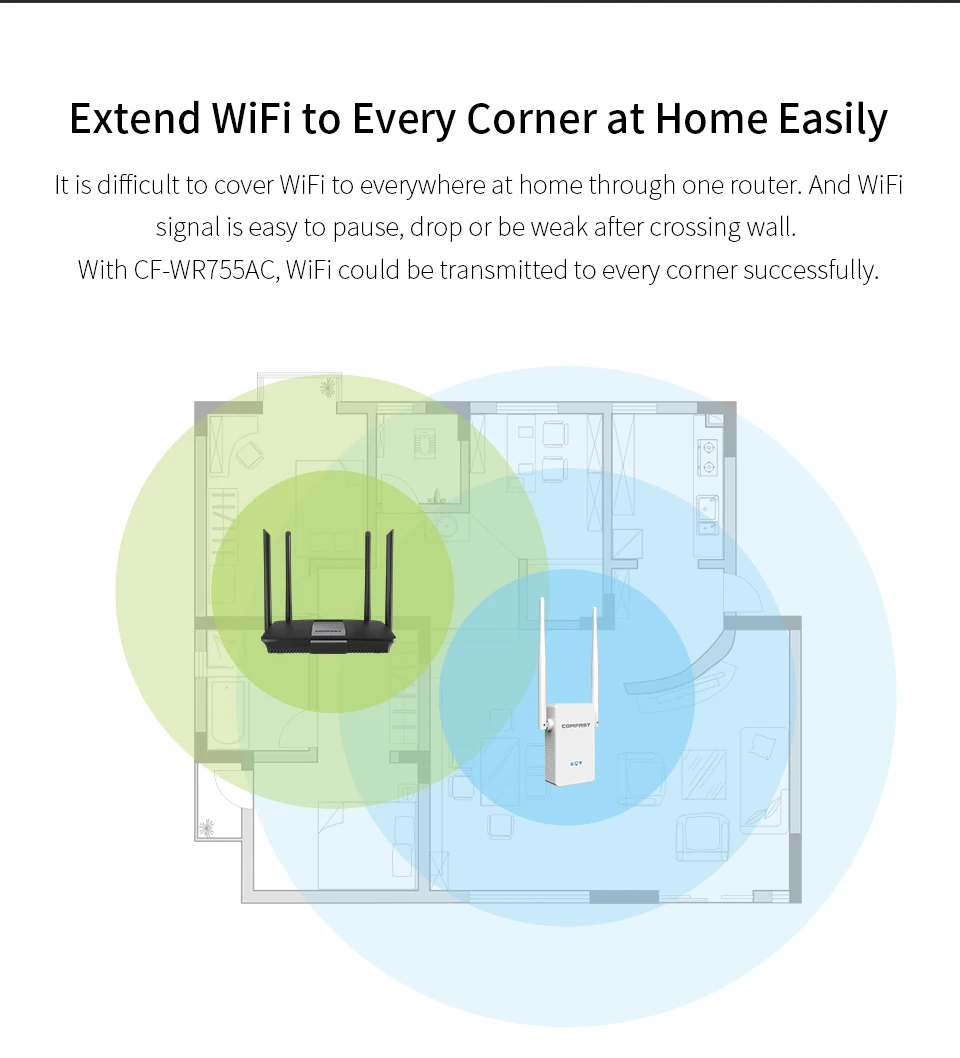 The CF-WR755AC is an 802.11ac dual-band extender with a wireless speed of up to 1200Mbps. It can be used with various routers, helping to eliminate signal blind spots and improve the coverage of wireless routers. This repeater is ideal for expanding existing 802.11ac wireless networks.