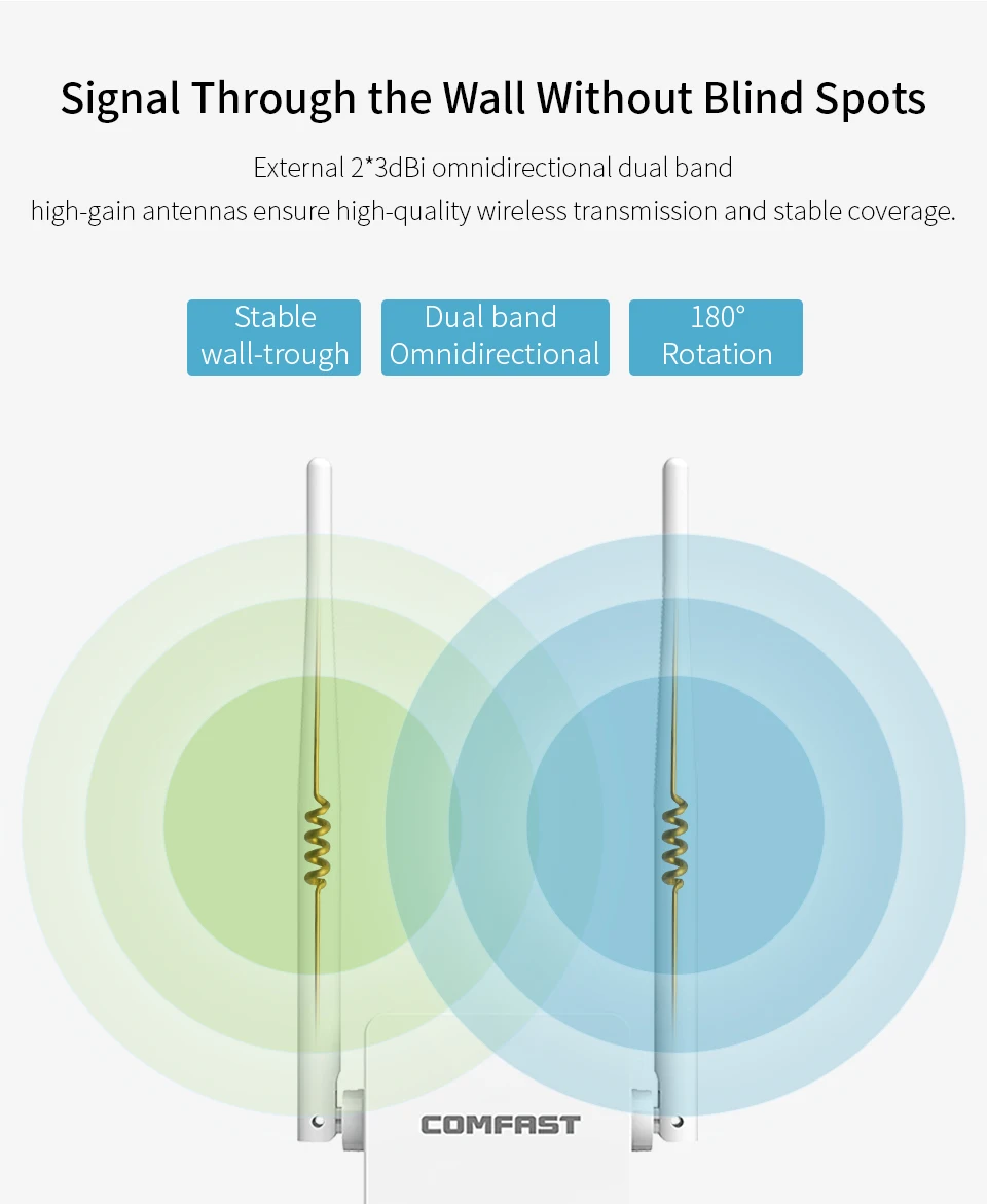 • External 2*3dBi dual-band antenna, strong signal;