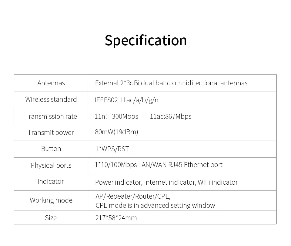 • Support IEEE802.11ac/a/b/g/n standard;