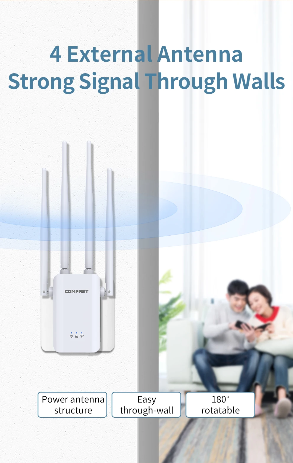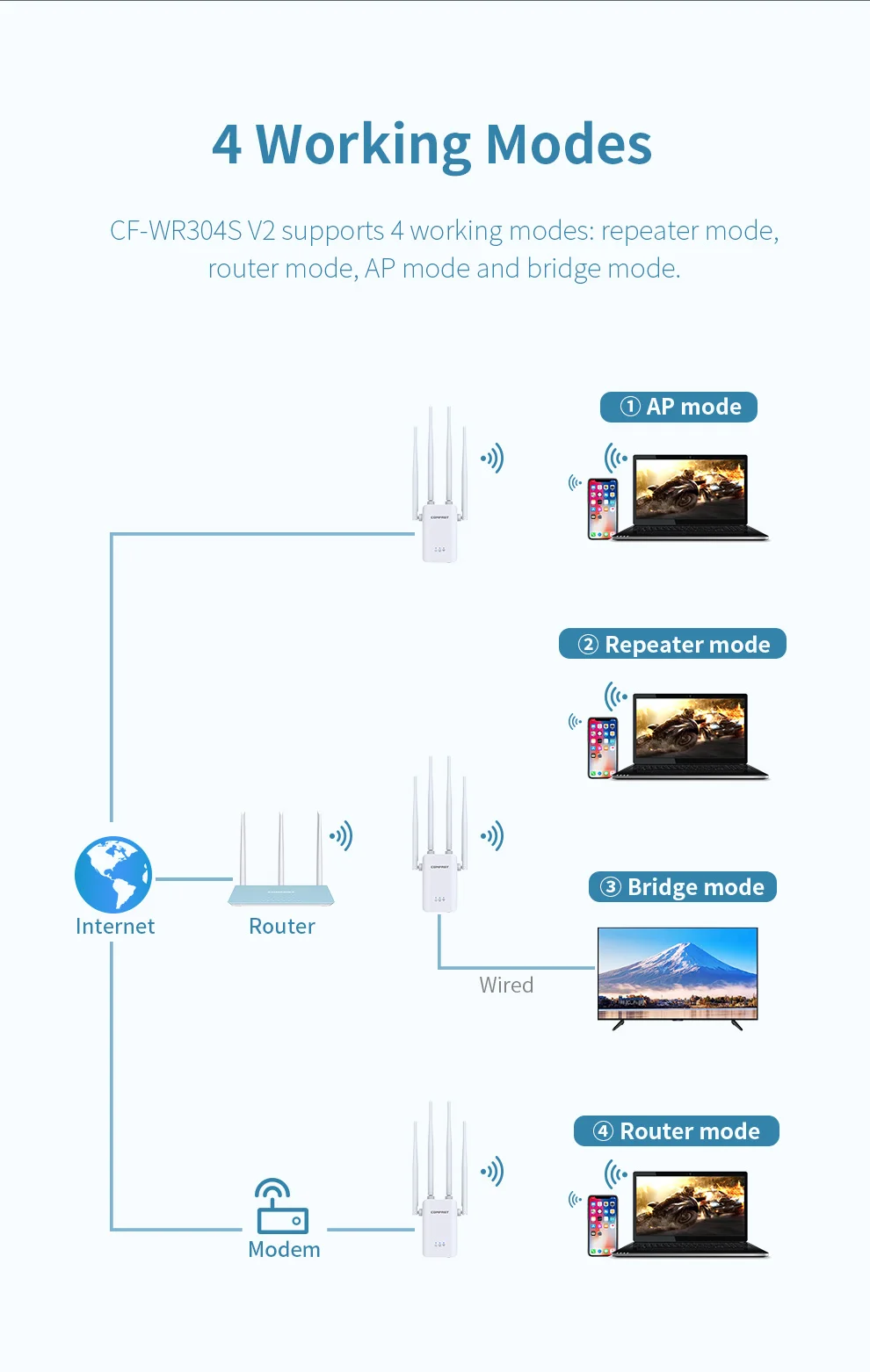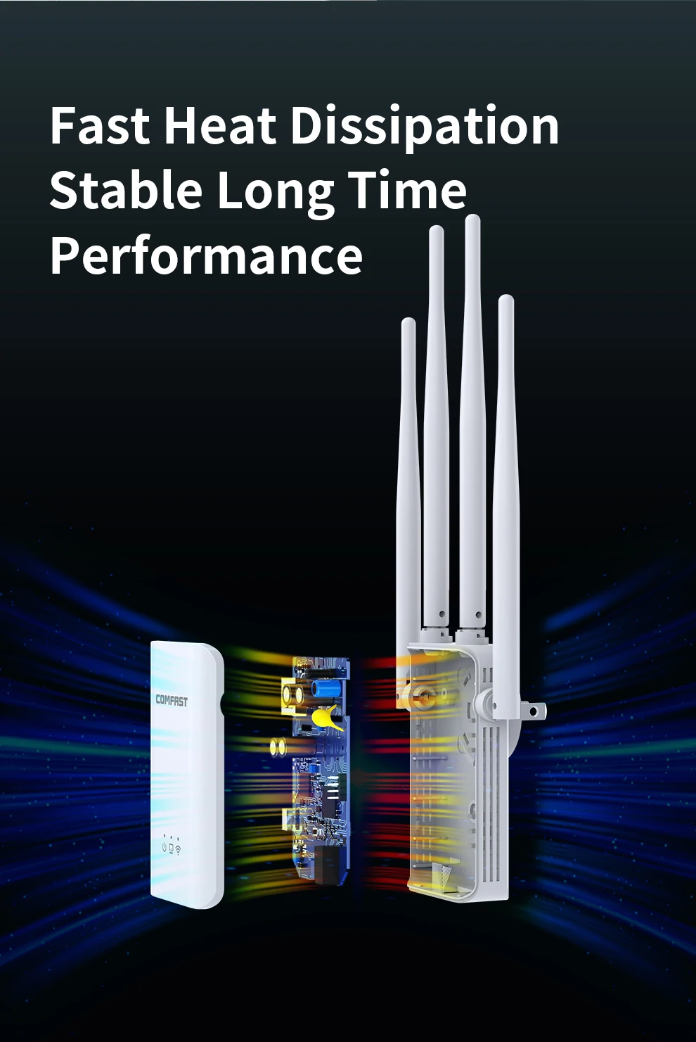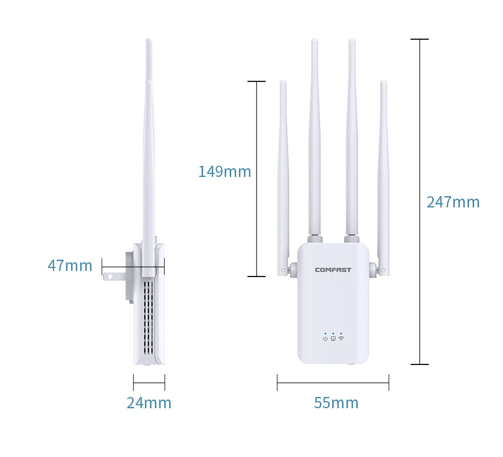Equipped with 4 high gain antennas, this WIFI repeater ensures a strong signal coverage for long distances.