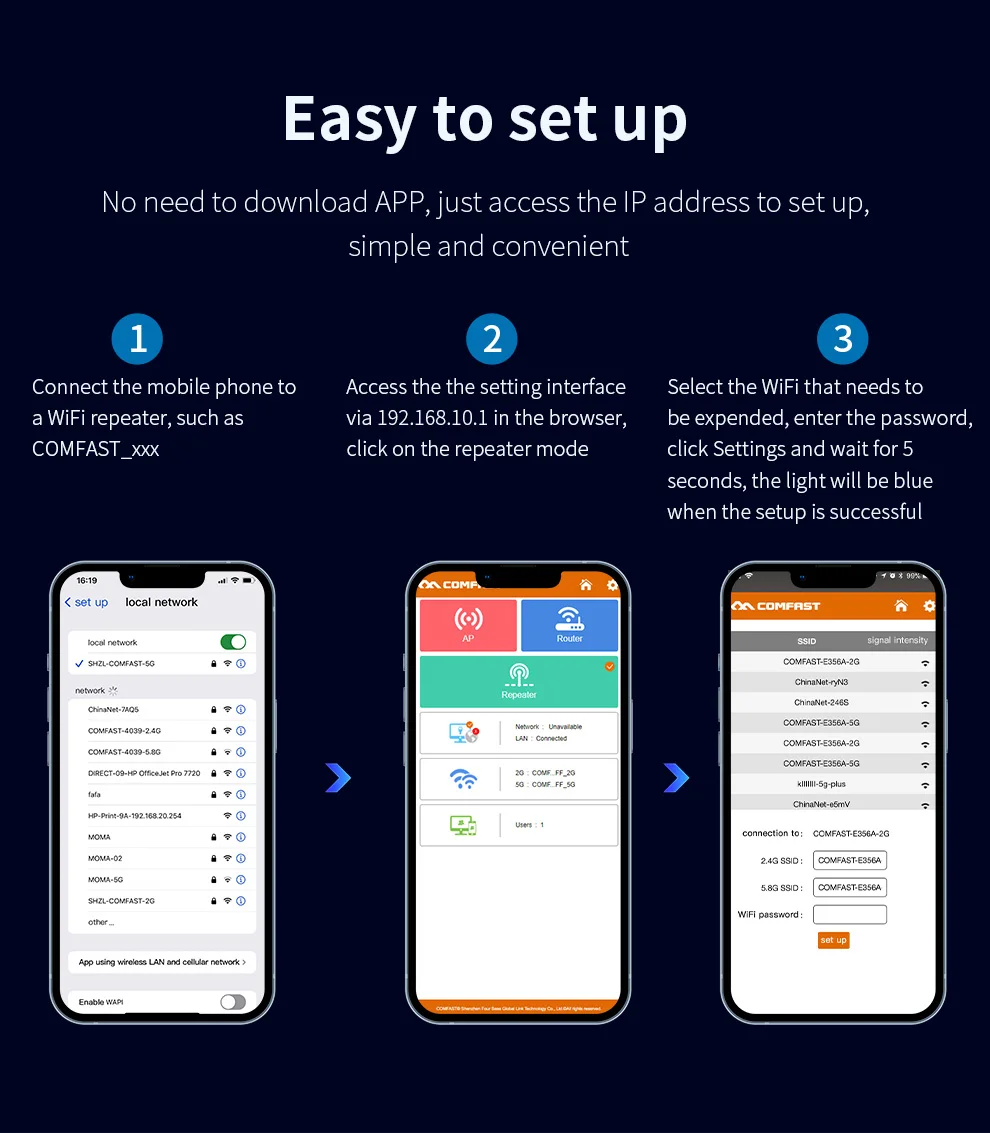 1.Connect your phone to the SSID of WiFi repeater, such as COMFAST_XXX