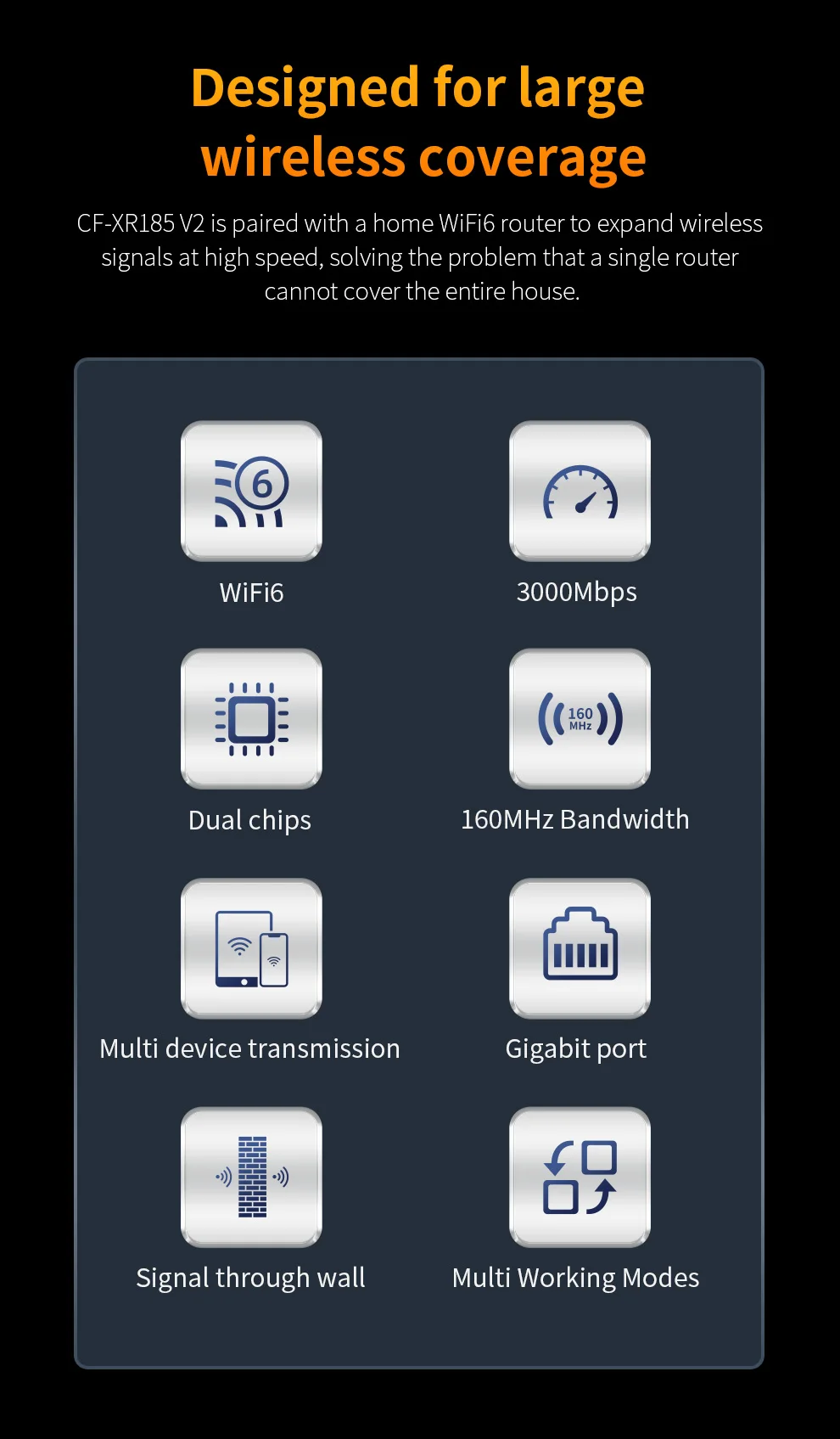CF-XR185 V2 is paired with a home WiFi6 router to expand wireless signals at high speed, solving the problem that a single router cannot cover the entire house.