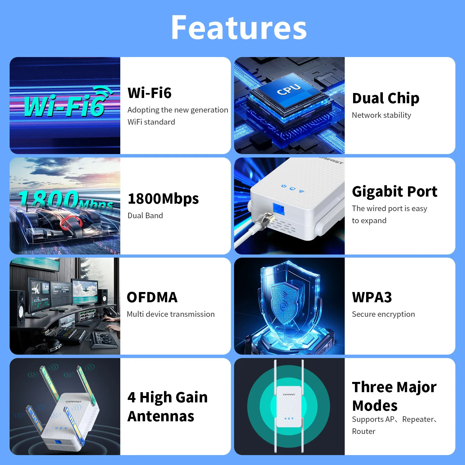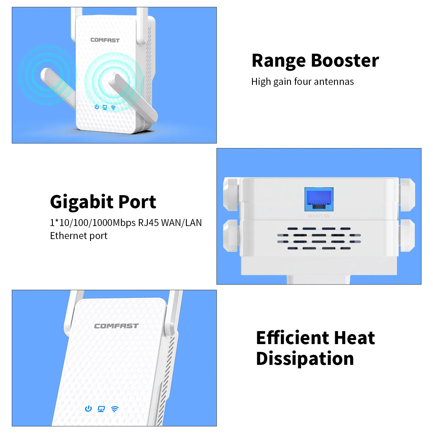 Four high gain omnidirectional antennas effectively enhance the sensitivity of WiFi signal transmission and reception, with fast speed and wider WiFi coverage