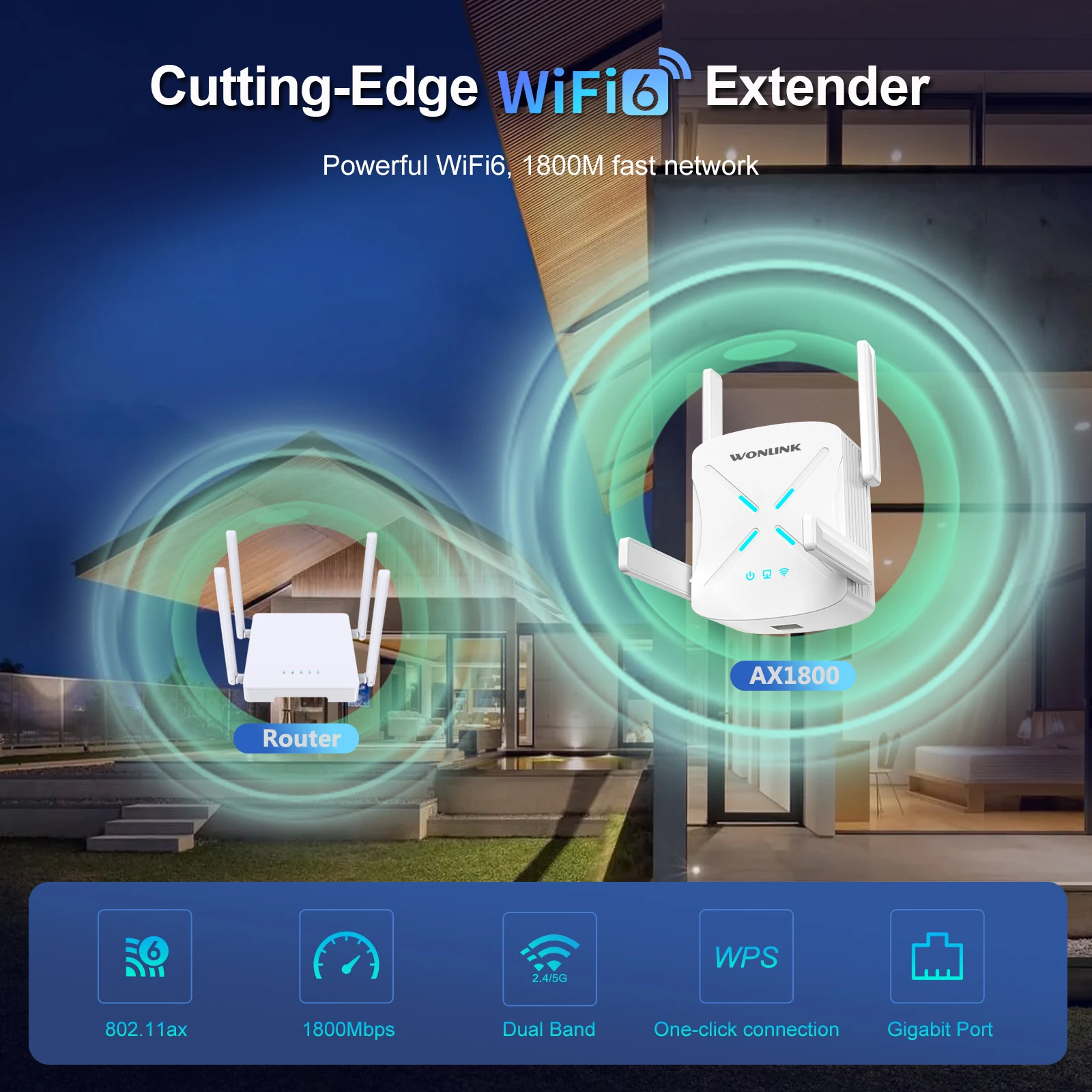 2.4G signal and 5.8G signal can be extended simultaneously, with a wireless speed of up to 1500Mbps and strong WiFi coverage