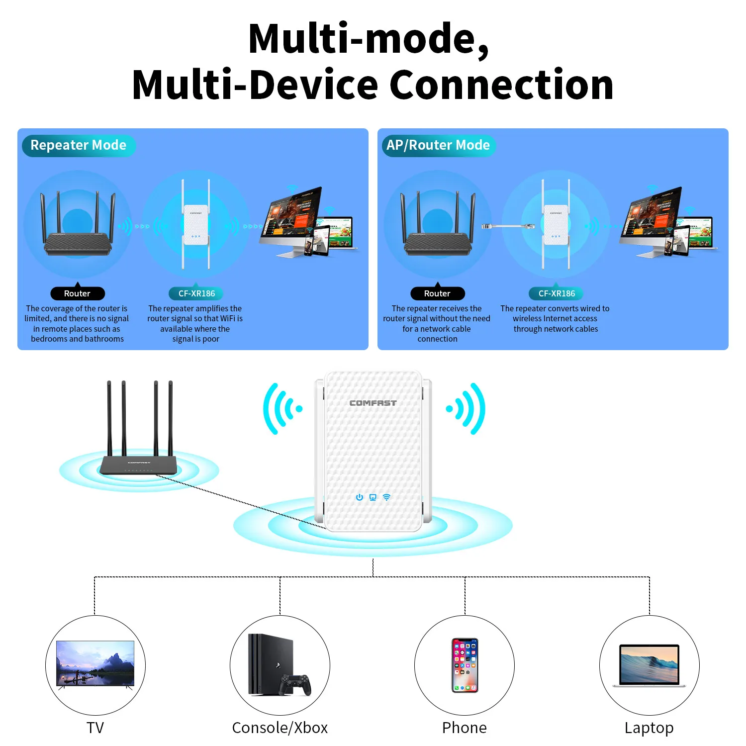CF-XR181 is a multi-antenna through-the-wall wireless repeater, with 1500Mbps Wifi 6 dual-band, stable signal, simple configuration and other features; for villas, duplexes, large homes and other home environments WiFi signal extension, effectively solve the signal blind spot problem, is a complex household, large family home good exte