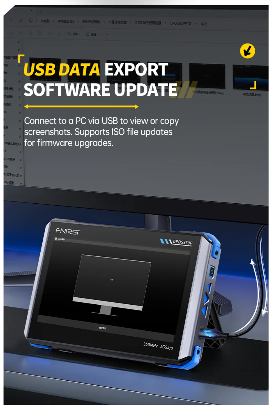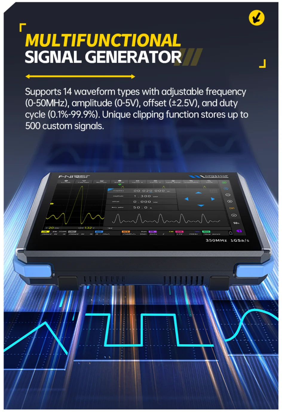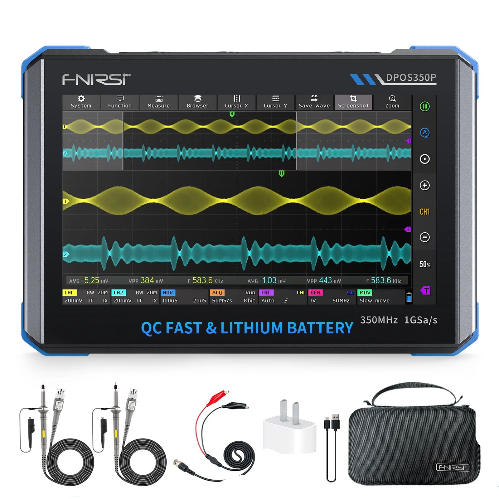 FNIRSI DPOS350P is a versatile 4-in-1 instrument that integrates a 350MHz dual-channel digital phosphor oscilloscope, a 50MHz full-function signal generator, a 200K~350MHz spectrum analyzer, and a 50MHz frequency response analyzer. It features a 1GSa/s real-time sampling rate, 350MHz analog bandwidth, and an ultra-high waveform refresh rate, enabling it to capture and display a wide range of signals clearly, particularly for complex signal analysis and low-probability anomaly detection. The built-in high-resolution display, touch operation, intelligent triggering, and multiple measurement modes make it a precise and reliable tool for testing and analysis in laboratories, production lines, and maintenance sites.