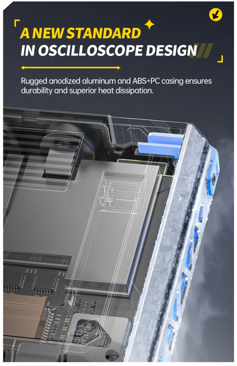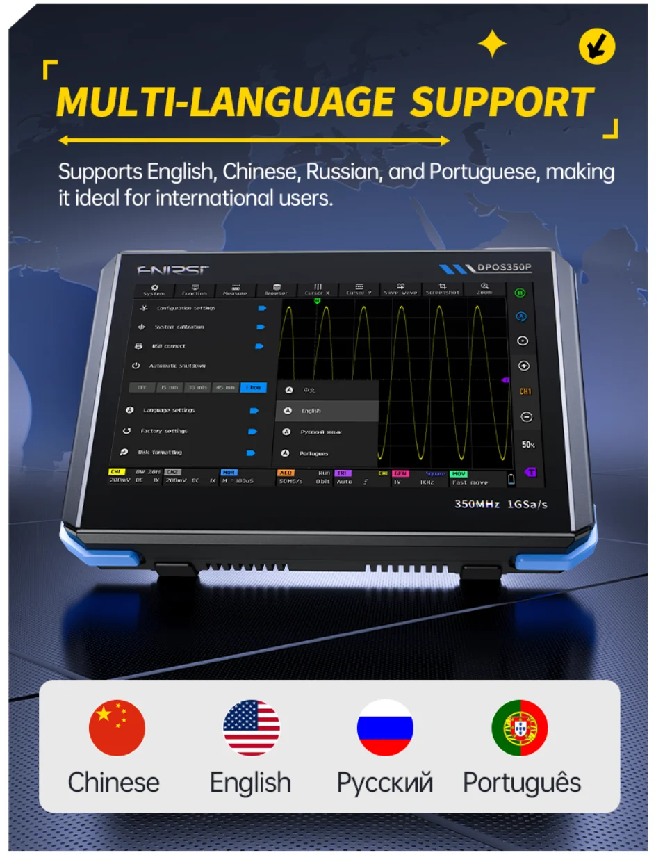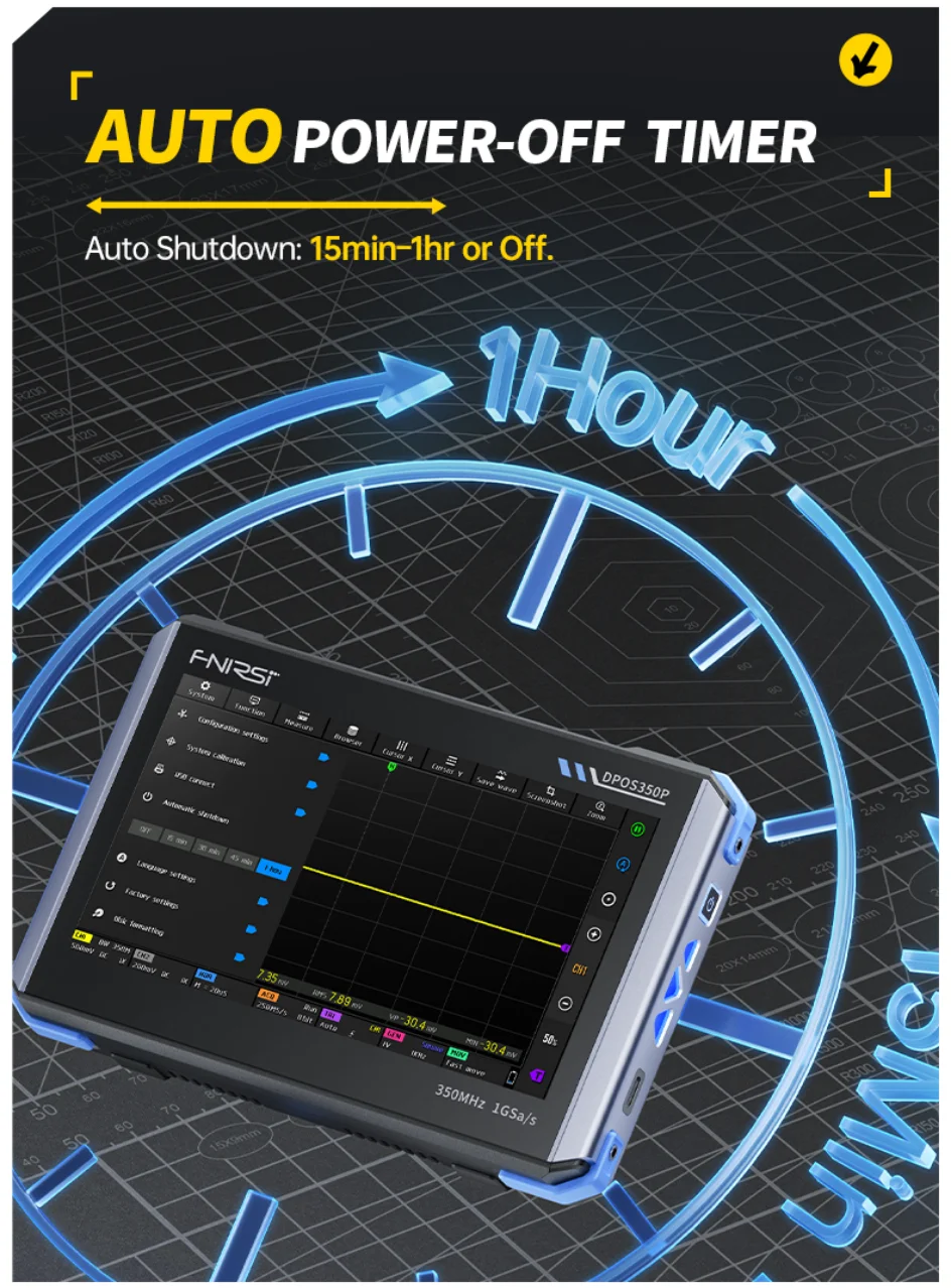 FNIRSI DPOS350P is a versatile 4-in-1 instrument that integrates a 350MHz dual-channel digital phosphor oscilloscope, a 50MHz full-function signal generator, a 200K~350MHz spectrum analyzer, and a 50MHz frequency response analyzer. It features a 1GSa/s real-time sampling rate, 350MHz analog bandwidth, and an ultra-high waveform refresh rate, enabling it to capture and display a wide range of signals clearly, particularly for complex signal analysis and low-probability anomaly detection. The built-in high-resolution display, touch operation, intelligent triggering, and multiple measurement modes make it a precise and reliable tool for testing and analysis in laboratories, production lines, and maintenance sites.