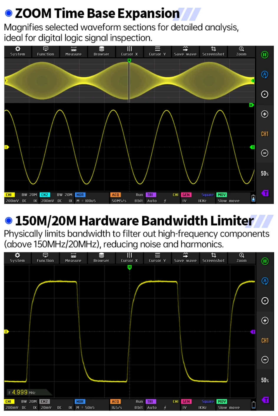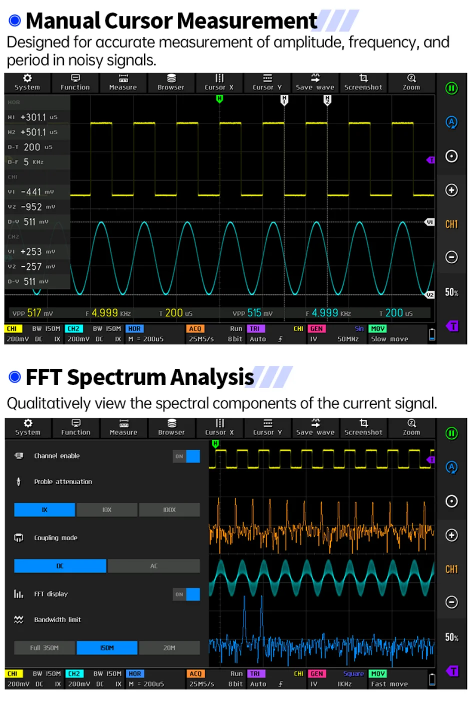 ● Rich signal generation and analysis capabilities: The built-in 50MHz signal generator supports 14 standard waveforms and custom waveform functionality, while the spectrum analyzer covers a frequency range of 200K~350MHz, ideal for EMI, RF, and high-frequency signal testing.