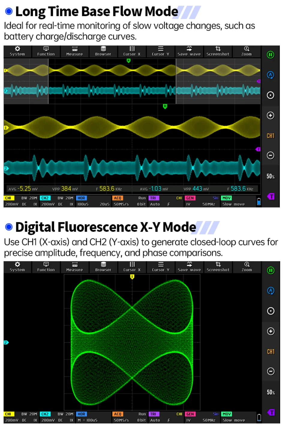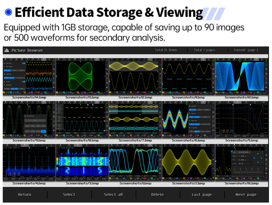 ● Fine display and operation: Equipped with a 7-inch 1024x600 high-resolution IPS touchscreen, it provides clear waveform display and supports grayscale and color temperature mode switching, making it easy to operate in different testing environments.