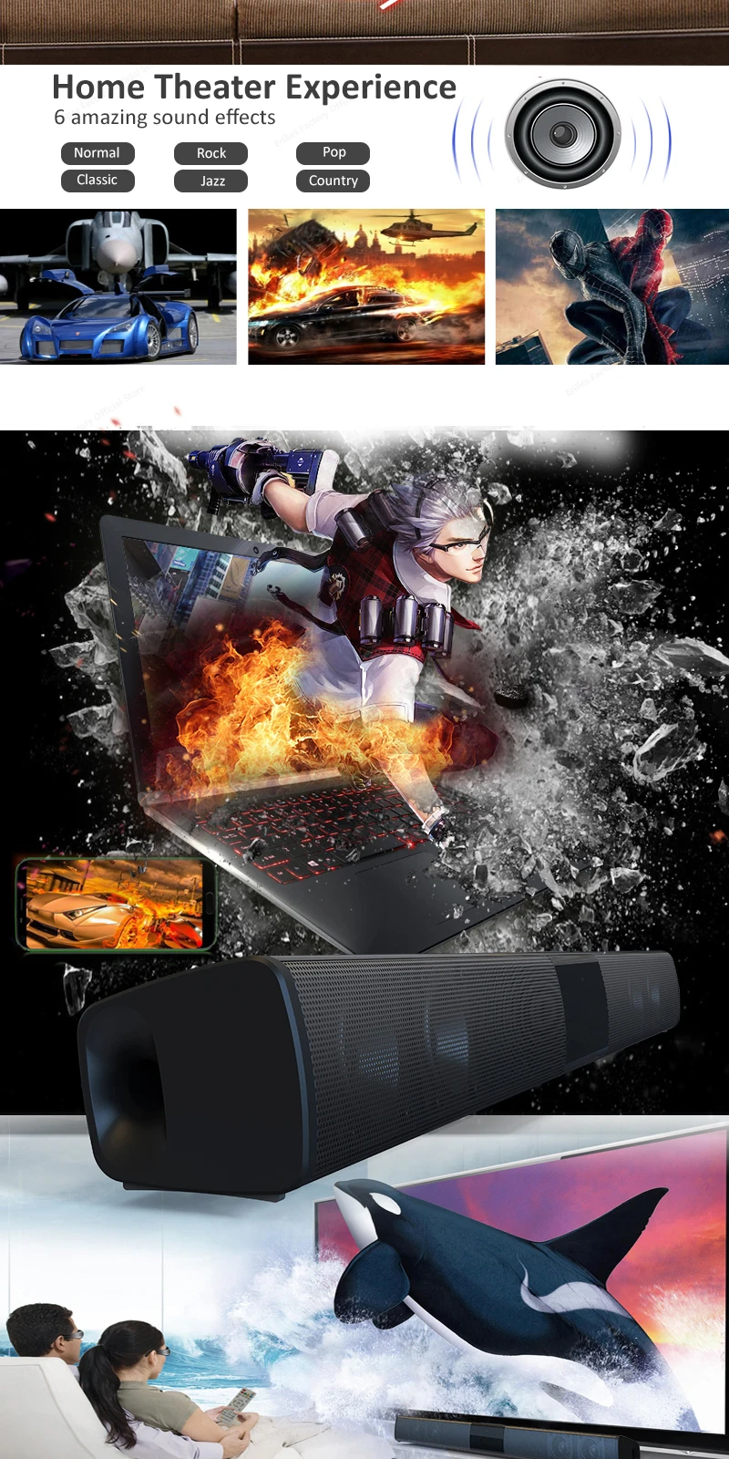 Bluetooth Surround Soundbar: with wireless Bluetooth 4.2 speaker, listening to your music with a tap of a finger, fit in smart TV, cellphone, tablet, laptop and so on
