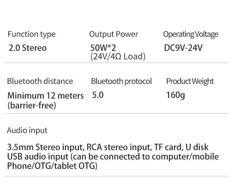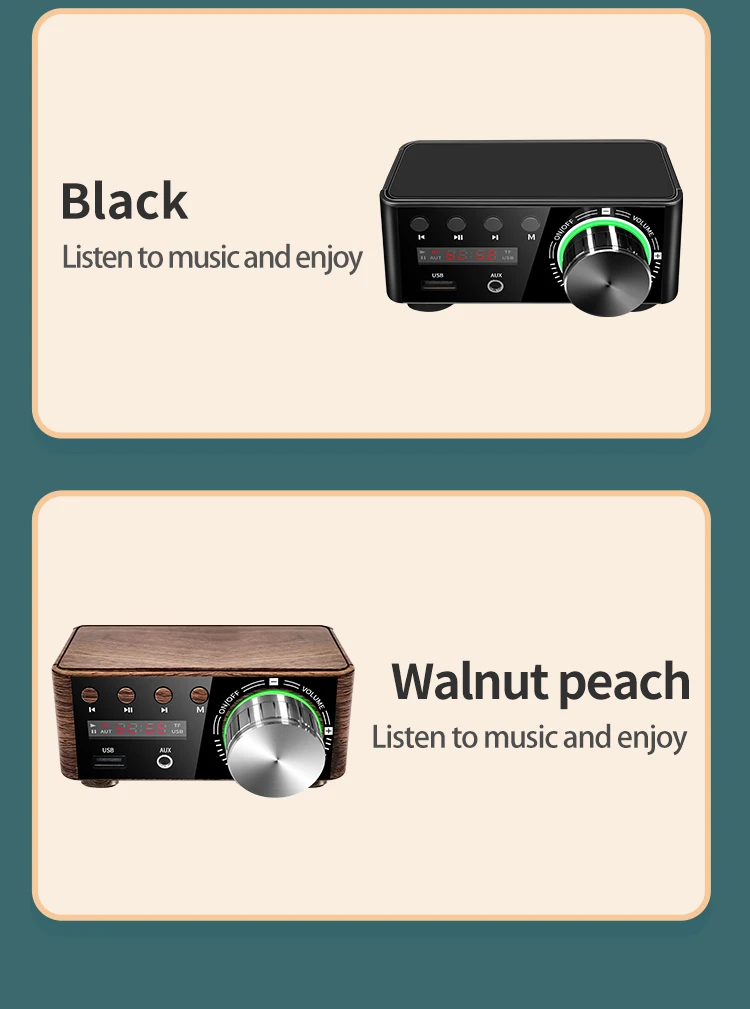 3.Supports RCA/AUX/USB/BT 5.0/TF Card inputs, compatible with all home audio device such as phone, tablet, computer, TV, set-box, CD player etc. U-disk and TF card support WAV, APE, FLAC lossless formats.