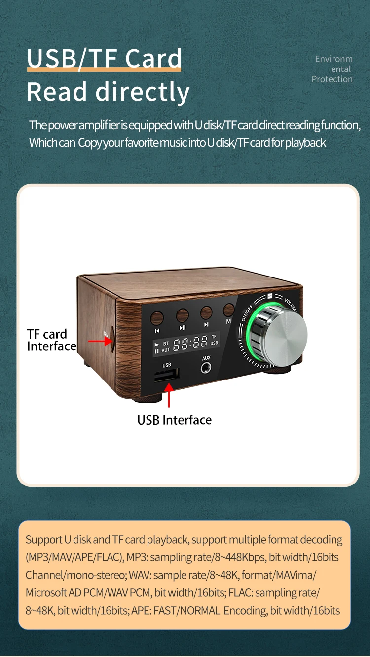 U-disk/TF Card Support Format: MP3, WAV, APE, FLAC