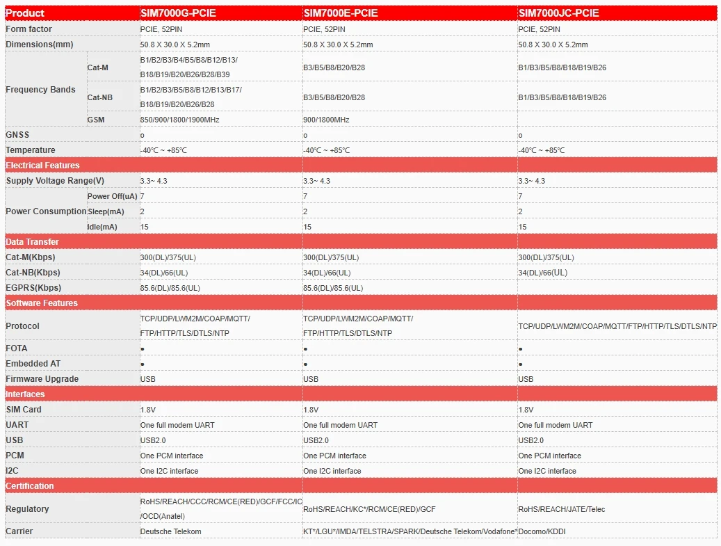 The SIM7000X-PCIE is LTE-FDD、TDD-LTE and Quad-Band GPRS/EDGE module solution in a PCIE type which supports LTE CAT-M1(eMTC) and NB-IoT up to 375kbps data transfer.