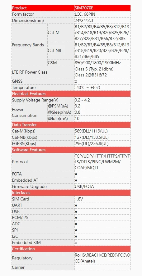 • With Power Saving Mode(PSM) and Extended Discontinuous Reception(eDRX), SIM7070E can extend battery life to 10 years.