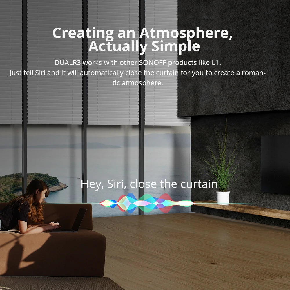 DUALR3 works with other SONOFF products like L1. Just tell Siri and it will automatically close the curtain for you to create a romantic atmosphere.